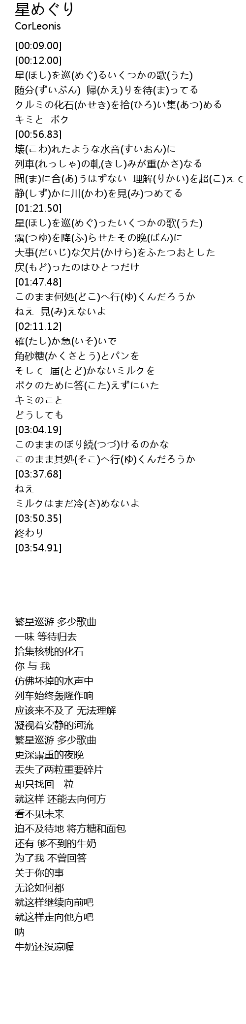 | [01:21.79] | 星(ほし)を巡(めぐ)ったいくつかの歌(うた) |