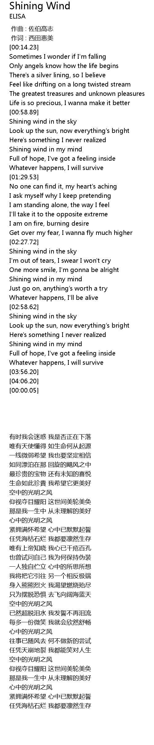 | [03:25.50] | Shining wind in the sky |