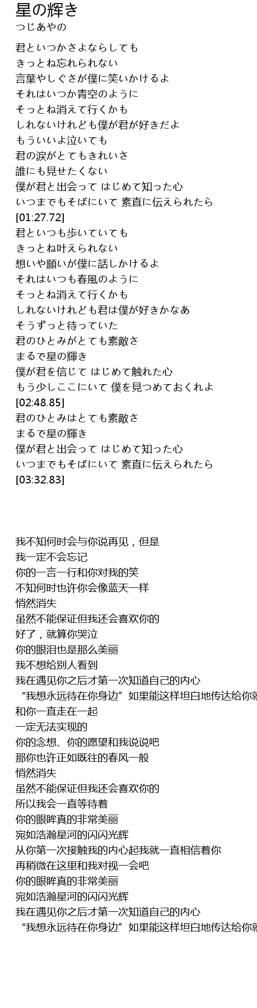 | [03:24.39] | いつまでもそばにいて 素直に伝えられたら |