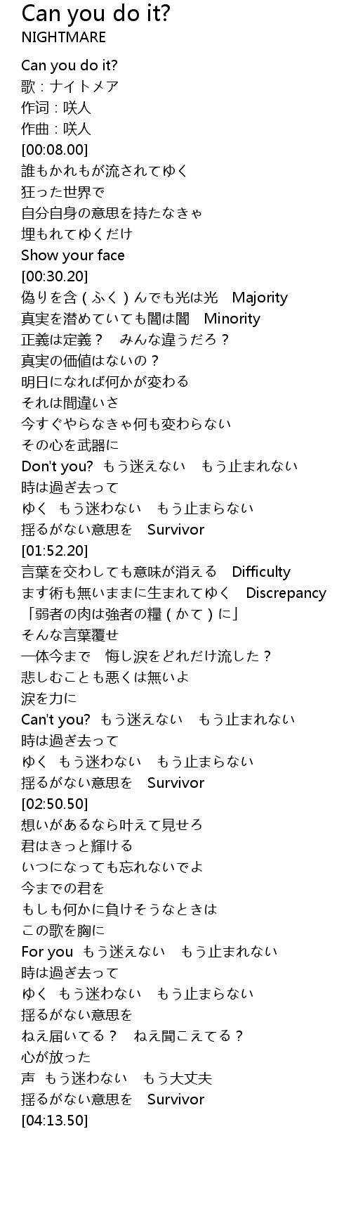 | [00:58.60] | 偽りを含(ふく)んでも光は光 Majority |