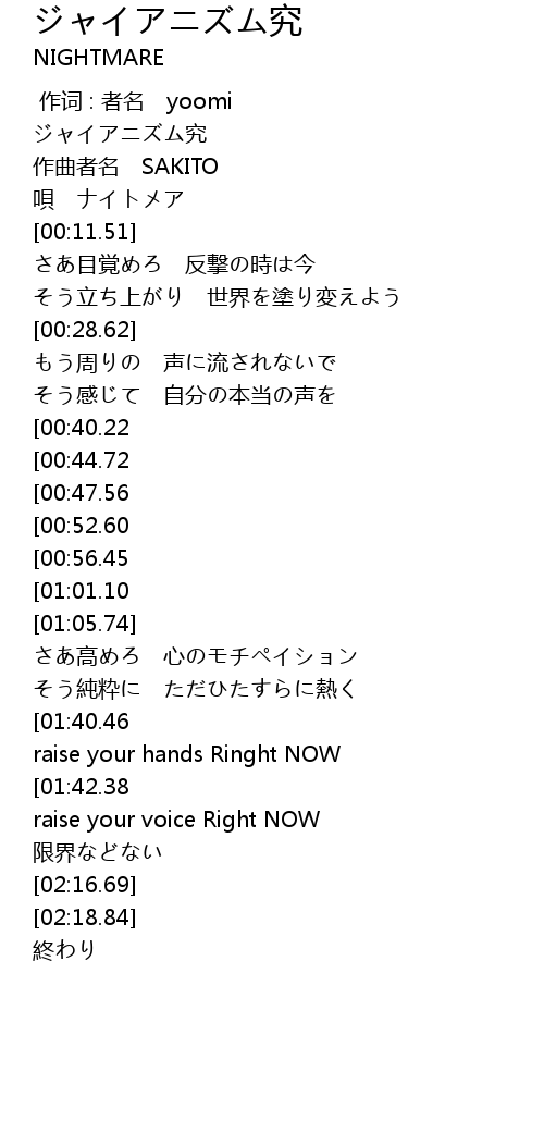 | [01:46.39][01:42.38][01:38.40][01:33.07][01:29.61][01:25.65] | Raise my voice, raise your voice Right NOW |