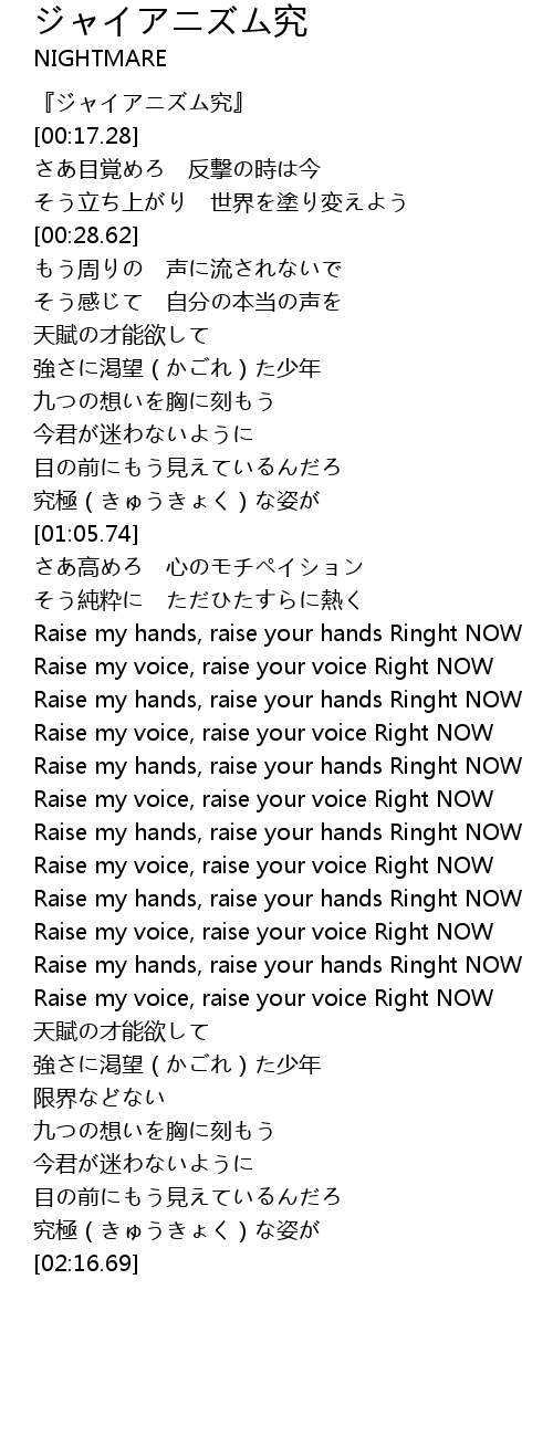 | [01:33.07] | Raise my voice, raise your voice Right NOW |