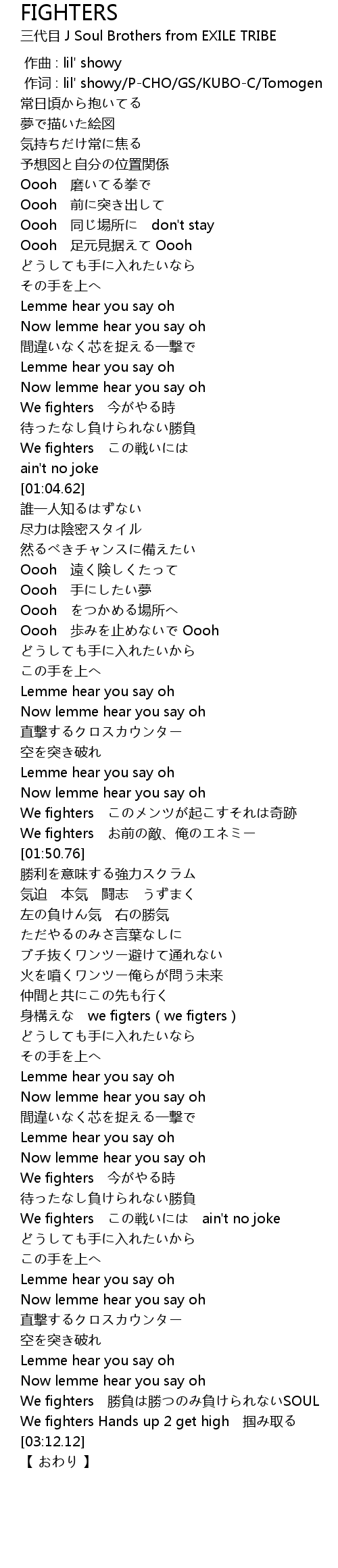 | [01:42.03] | We fighters このメンツが起こすそれは奇跡 |
