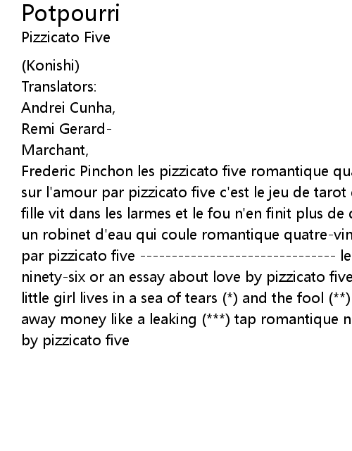 Frederic Pinchon les pizzicato five romantique quatre-vingt seize ou un essai sur l'amour par pizzicato five c'est le jeu de tarot qui me l'a dit la petite fille vit dans les larmes et le fou n'en finit plus de donner de l'argent comme un robinet d'eau qui coule romantique quatre-vingt seize ou un essai sur l'amour par pizzicato five ------------------------------- les pizzicato five romantique ninety-six or an essay about love by pizzicato five the tarot deck told me the little girl lives in a sea of tears (*) and the fool (**) will not stop giving away money like a leaking (***) tap romantique ninety-six or an essay about love by pizzicato five |