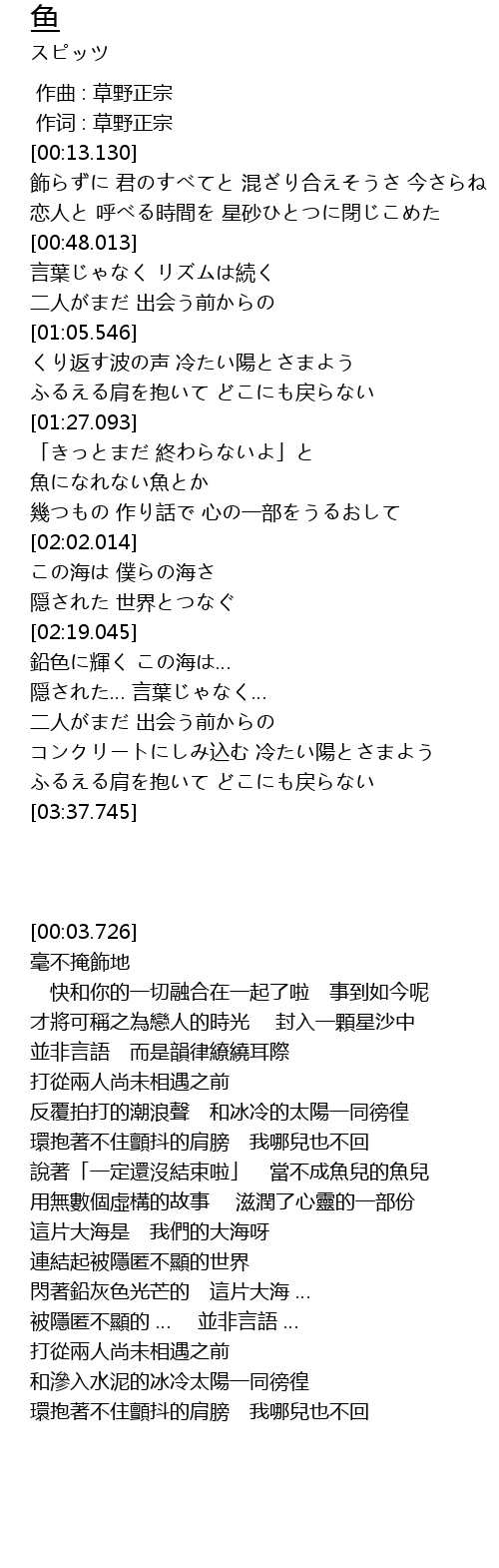 | [01:27.294] | 說著「一定還沒結束啦」 當不成魚兒的魚兒 |