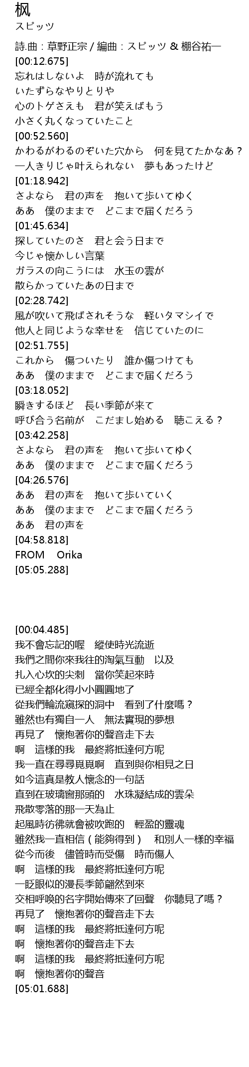 | [00:04.485] | 詩.曲:草野正宗/編曲:スピッツ & 棚谷祐一 |
