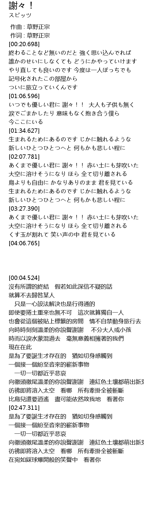 | [01:07.784] | いつでも優しい君に 謝々!! 大人も子供も無く |