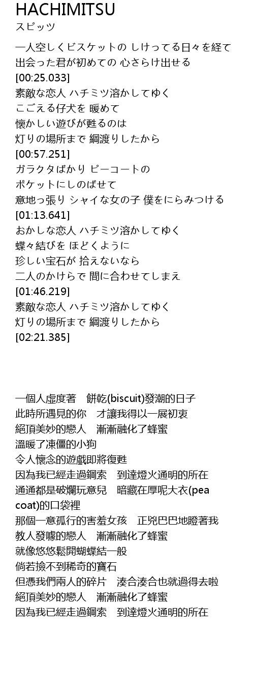 | [02:02.072] | 素敵な恋人 ハチミツ溶かしてゆく |