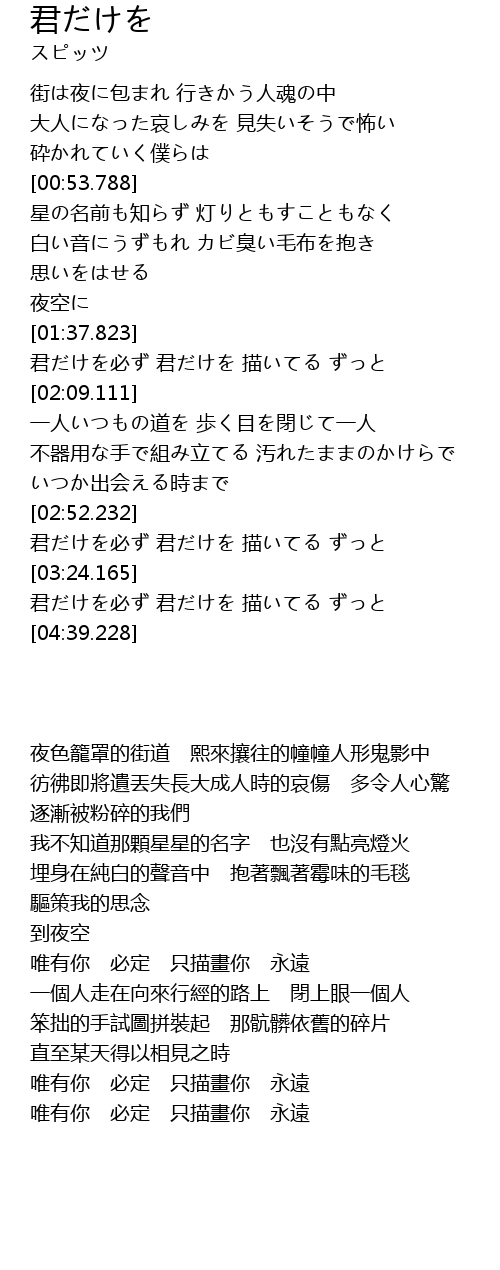 | [03:57.604] | 君だけを必ず 君だけを 描いてる ずっと |