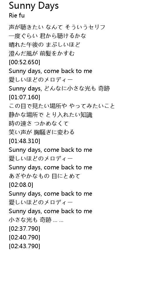 | [01:00.100] | Sunny days, どんなに小さな光も 奇跡 |
