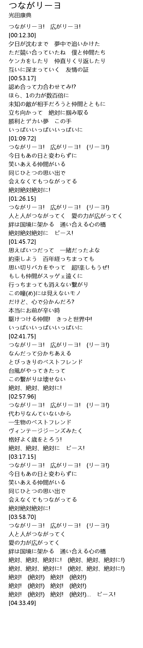| [03:59.71] | つながリーヨ! 広がリーヨ! (リーヨ!) |