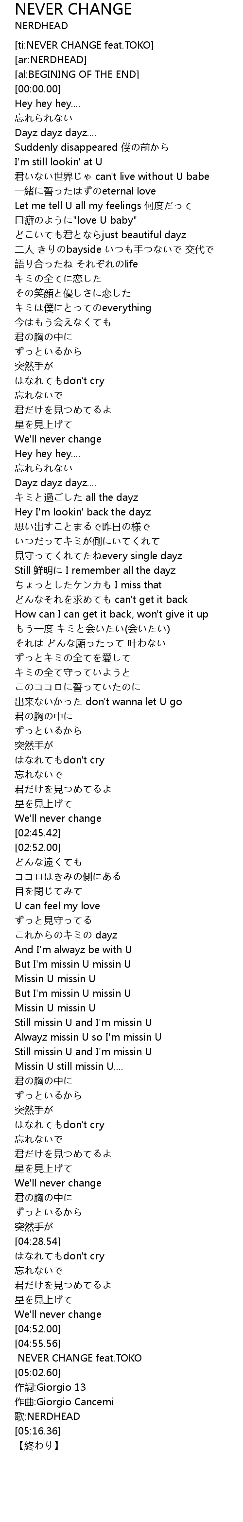 | [04:59.12] | NEVER CHANGE feat.TOKO |