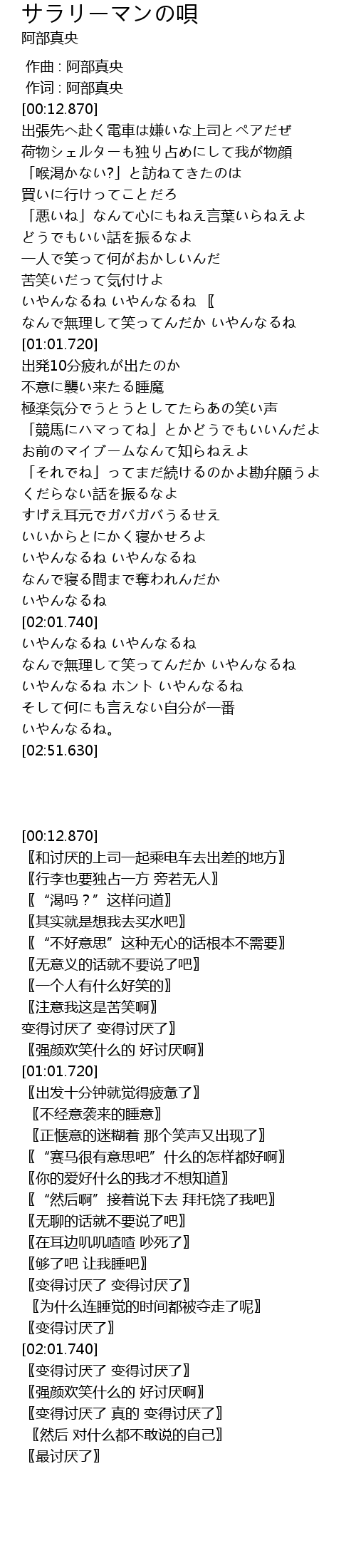 | [00:14.870] | 出張先へ赴く電車は嫌いな上司とペアだぜ |