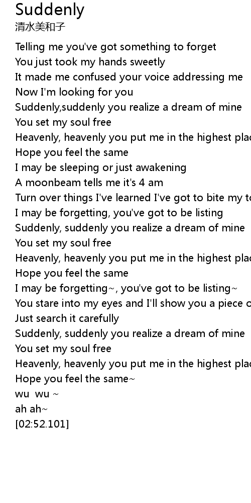 | [02:24.942] | Suddenly, suddenly you realize a dream of mine |