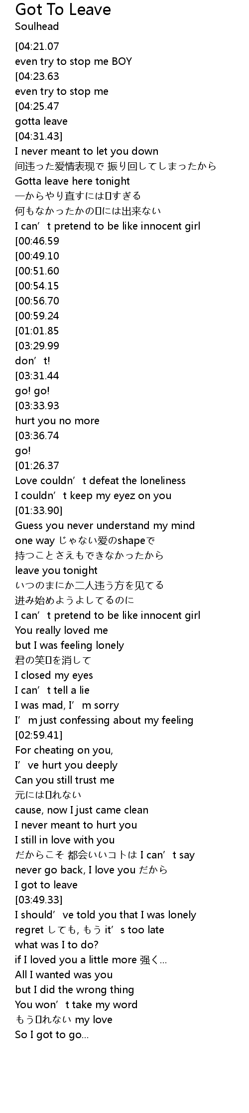 | [04:30.16][04:25.47][04:19.98][04:15.15][00:25.45][00:20.43][00:15.00][00:10.28] | I gotta leave |