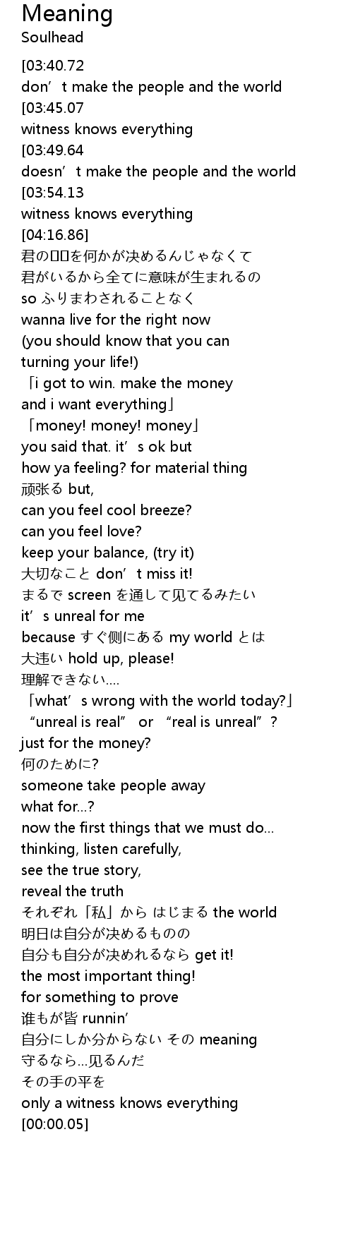 | [03:58.68][03:40.72][02:37.33][02:19.51][01:24.67][01:07.05][00:12.43] | money don’t make the people and the world |