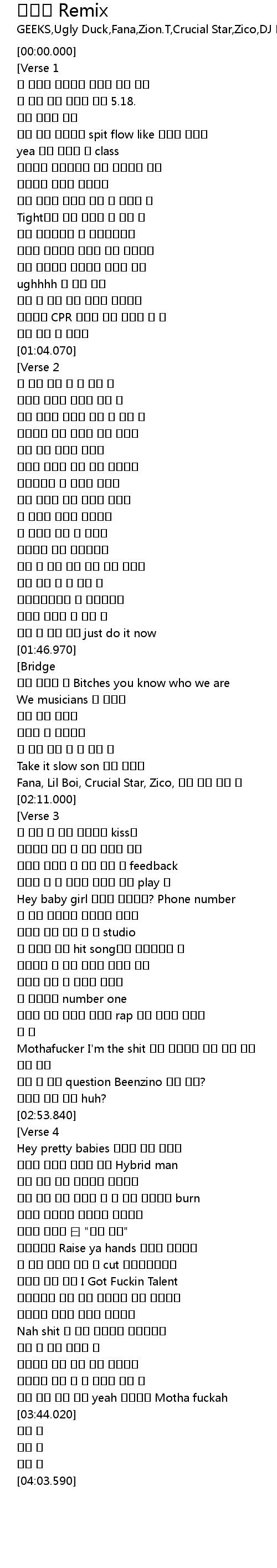 | [02:05.910] | Fana, Lil Boi, Crucial Star, Zico, 오리 완전 불이 나 |