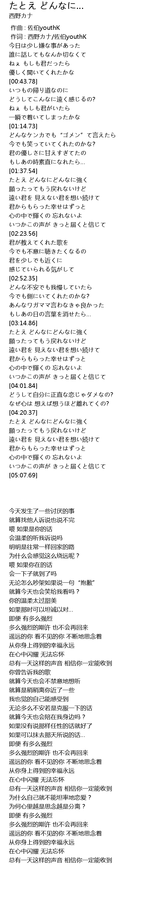 | [00:01.00] | 作词 : 西野カナ/佐伯youthK |