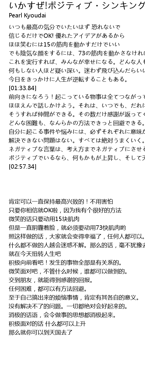 | [02:51.16] | ポジティブでいるなら、何もかもが上昇し、そして天国にいける。 |