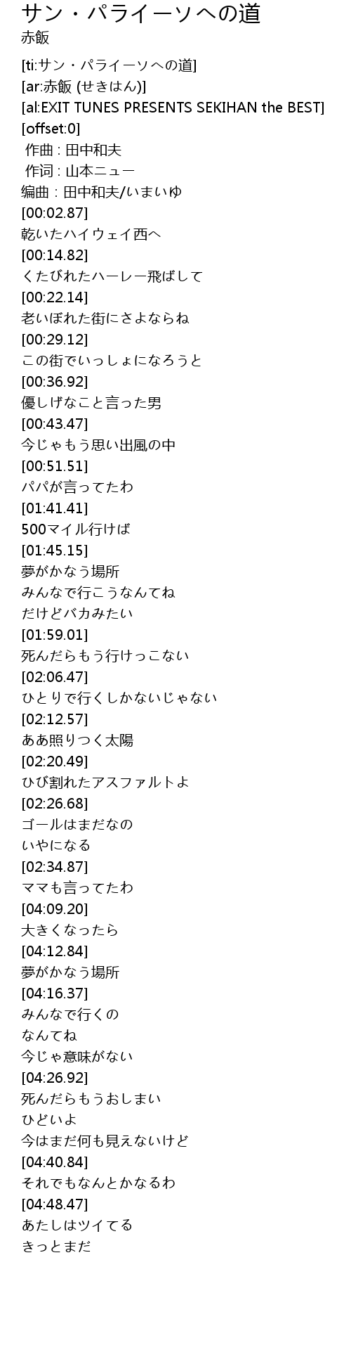 | [00:10.12] | 乾いたハイウェイ西へ |