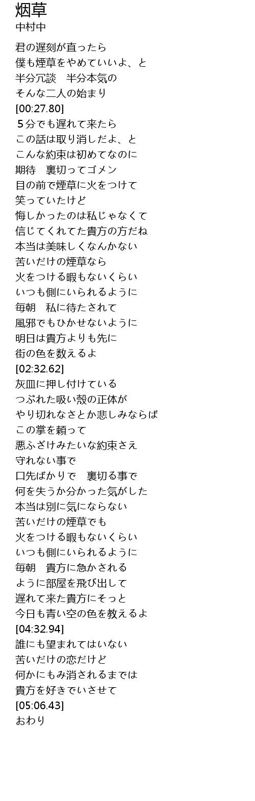 | [00:08.18] | 僕も煙草をやめていいよ、と |