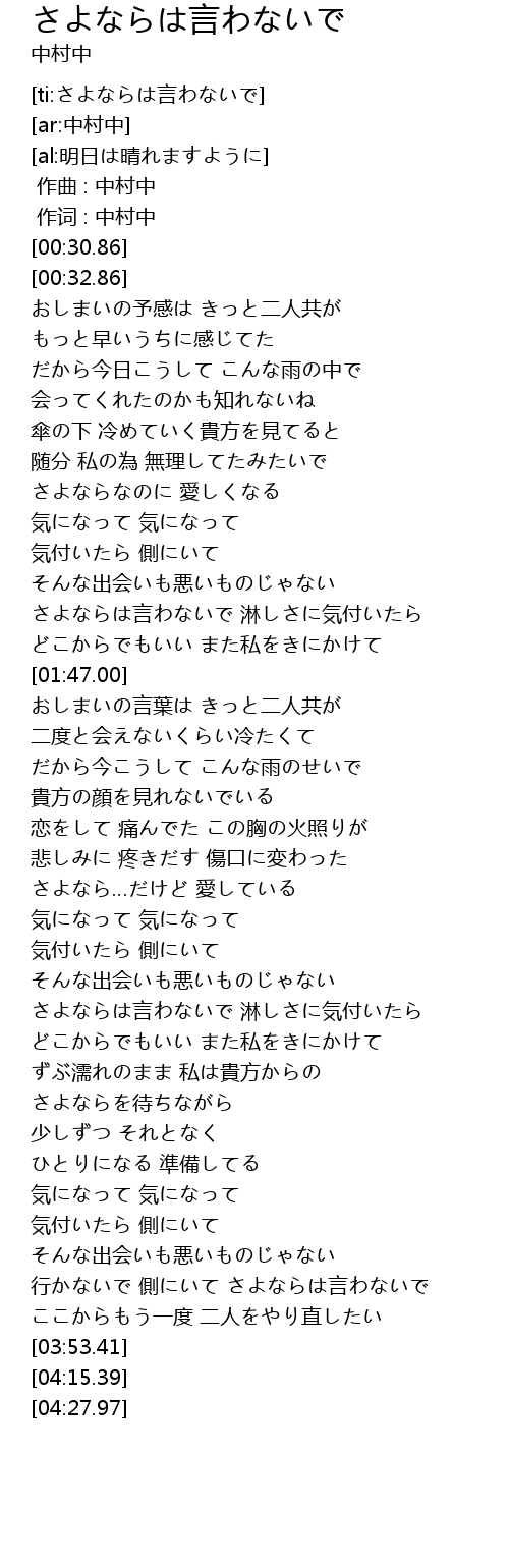 | [01:29.43] | さよならは言わないで 淋しさに気付いたら |