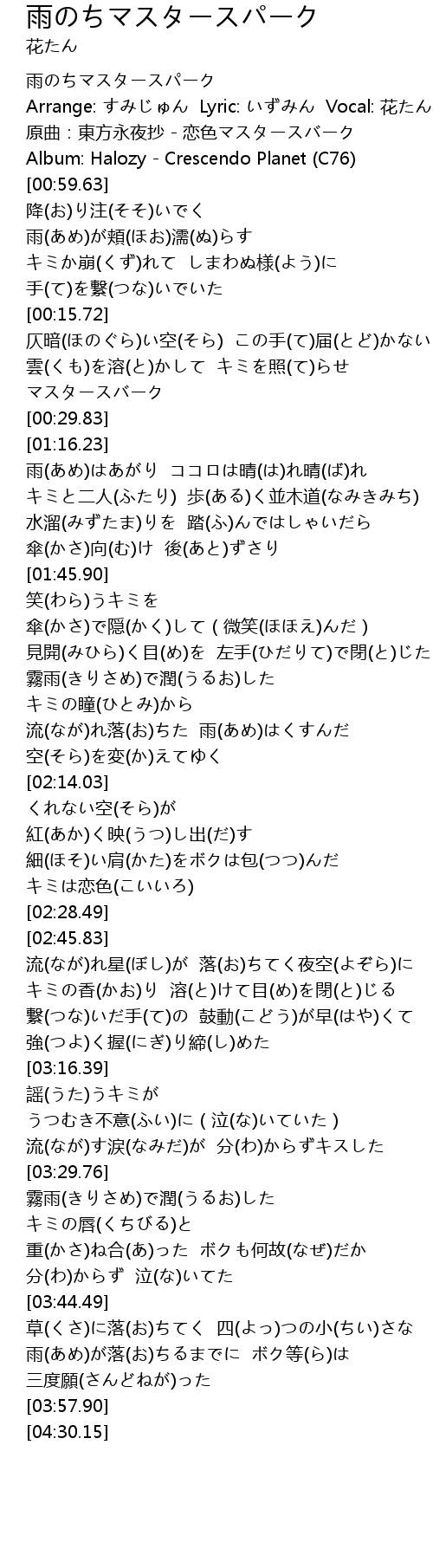 | [03:51.88] | 雨(あめ)が落(お)ちるまでに ボク等(ら)は |