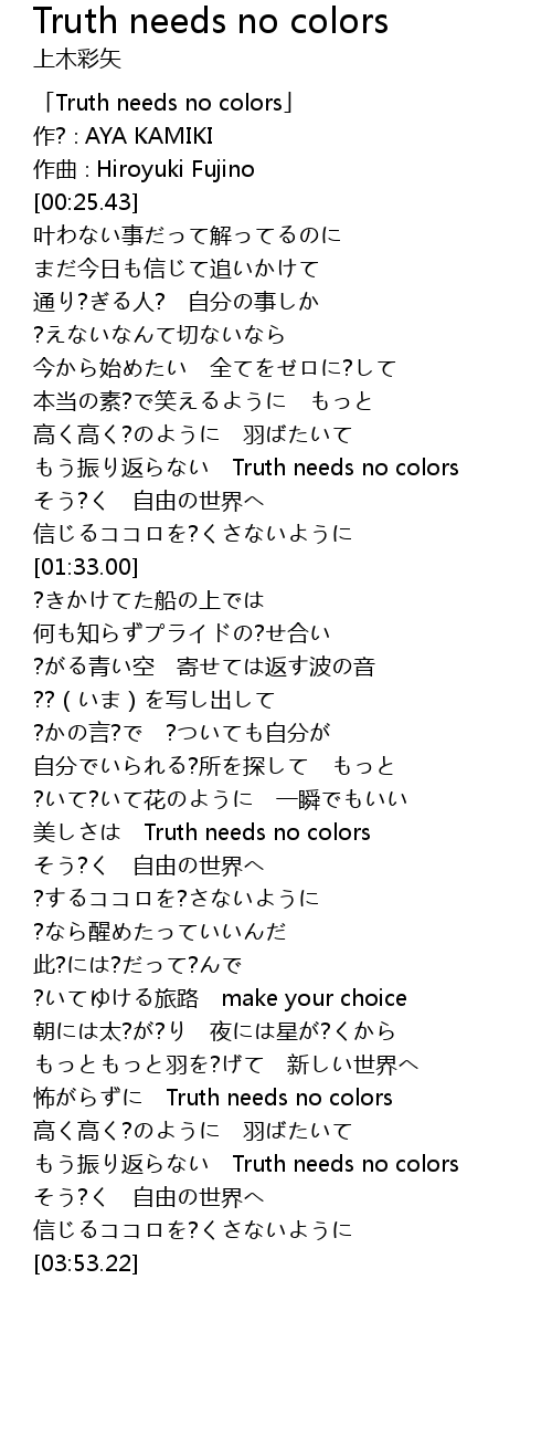 | [03:23.76] | 怖がらずに Truth needs no colors |