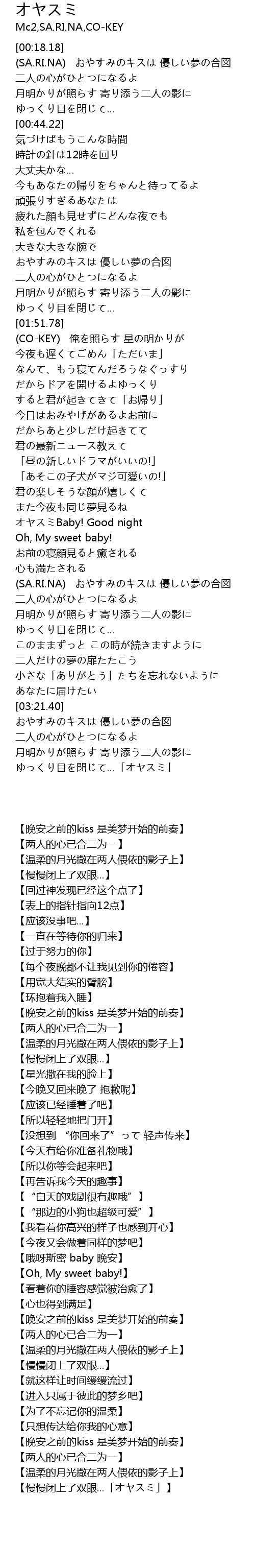 | [00:22.26] | (SA.RI.NA) おやすみのキスは 優しい夢の合図 |