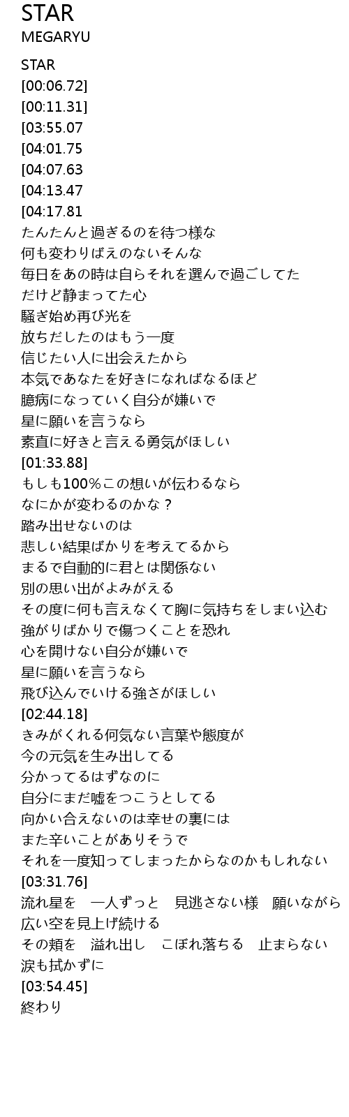 | [03:32.13] | 流れ星を 一人ずっと 見逃さない様 願いながら |