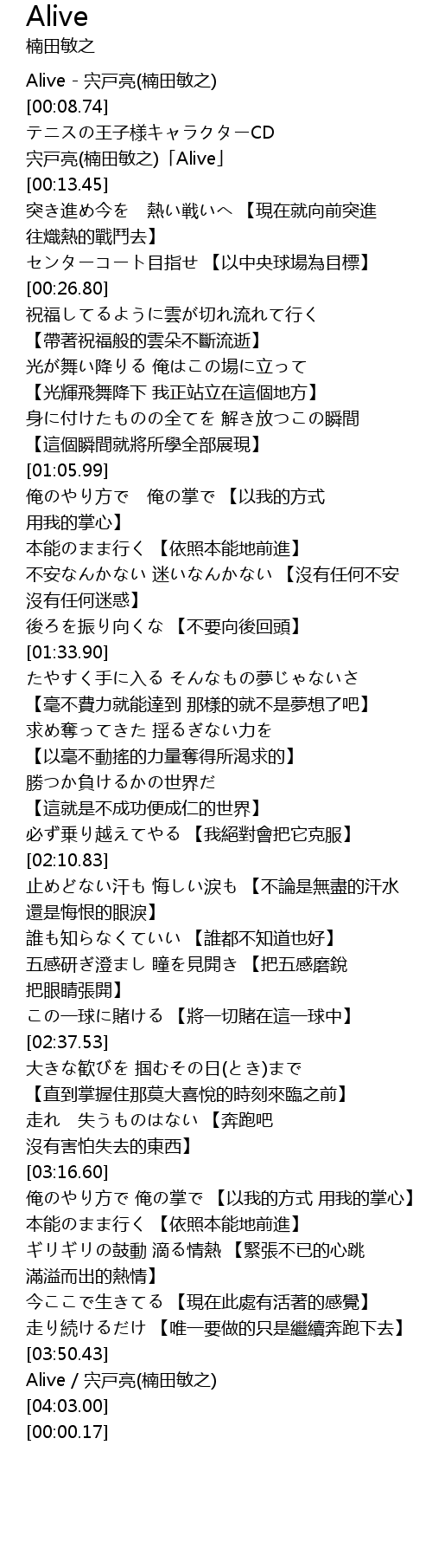 | [00:02.74] | Alive - 宍戸亮(楠田敏之) |