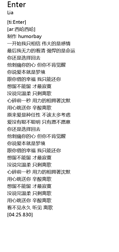 | [03:31.750] | 用心跳送你 辛酸离歌 |