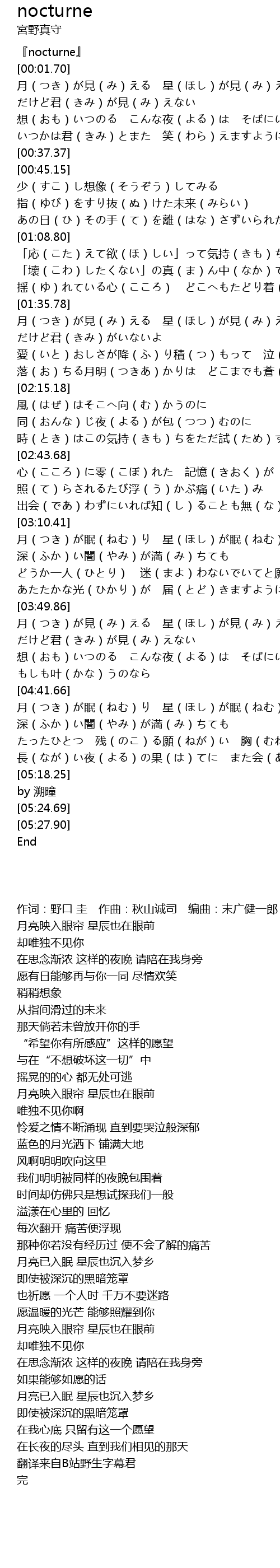 | [02:01.47] | 落(お)ちる月明(つきあ)かりは どこまでも蒼(あお)く |
