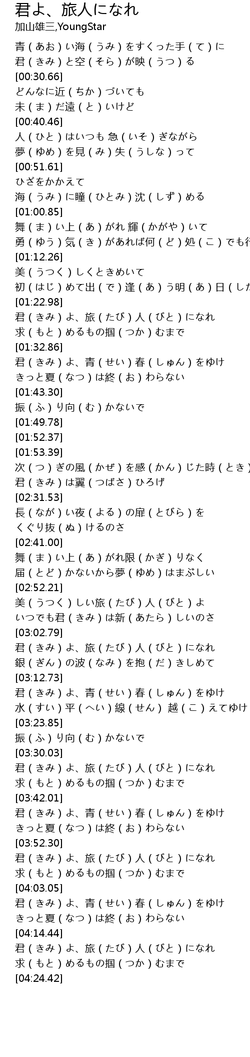 | [03:03.21] | 君(きみ)よ、旅(たび)人(びと)になれ 銀(ぎん)の波(なみ)を抱(だ)きしめて |