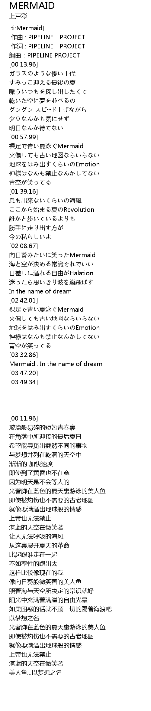 | [02:52.41] | 裸足で青い夏泳ぐMermaid |
