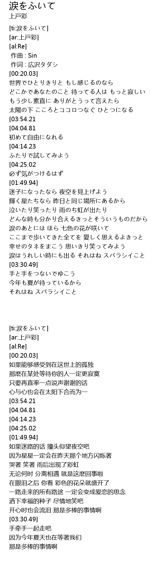 | [01:07.03][03:54.21] | 涙をふいたら ほら 知らない明日が見える |