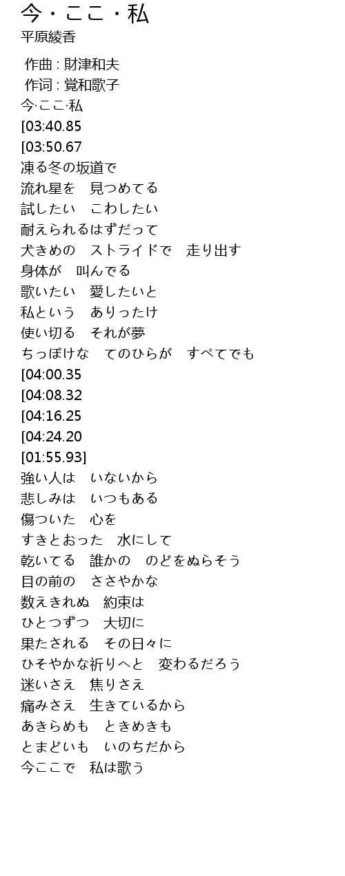 | [00:12.00][03:40.85][04:35.04][05:06.37] | 平原綾香-今·ここ·私 |