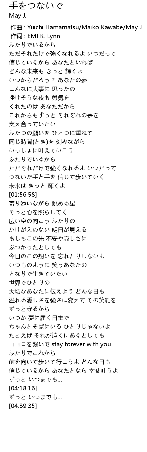 | [00:00.00] | 作曲 : Yuichi Hamamatsu/Maiko Kawabe/May J. |