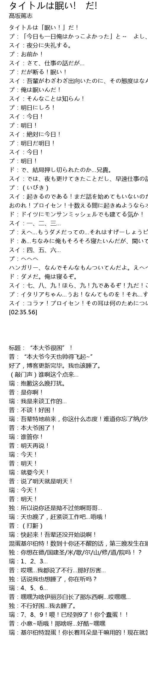 | [00:06.68] | 普:“本大爷今天也帅得飞起~” 好了,博客更新完毕。我也该睡了。 (敲门声)谁啊这个点来… |