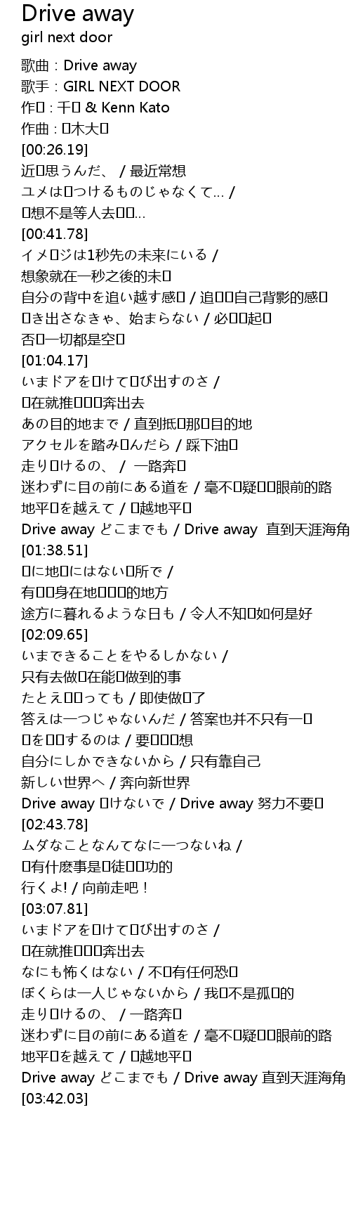 | [01:32.96] | Drive away どこまでも / Drive away 直到天涯海角 |