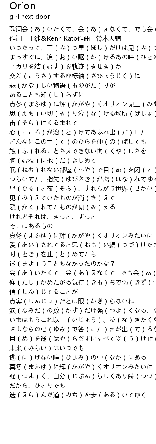 | [00:42.14] | 真冬(まふゆ)に辉(かがや)くオリオン见上(みあ)げて |
