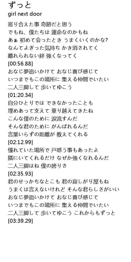 | [03:27.77] | 二人三脚して 歩いてゆこう これからもずっと |