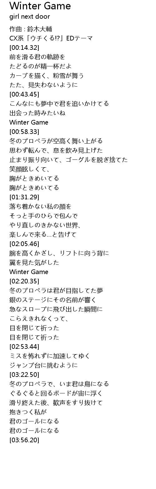 | [00:59.28] | 冬のプロペラが空高く舞い上がる |