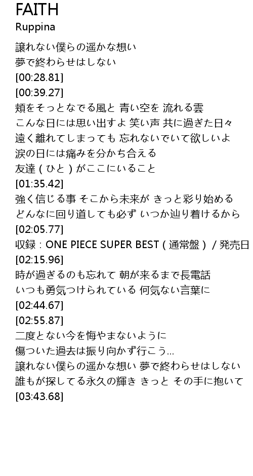 | [02:07.77] | 収録:ONE PIECE SUPER BEST(通常盤)/発売日:2007/03/07 |