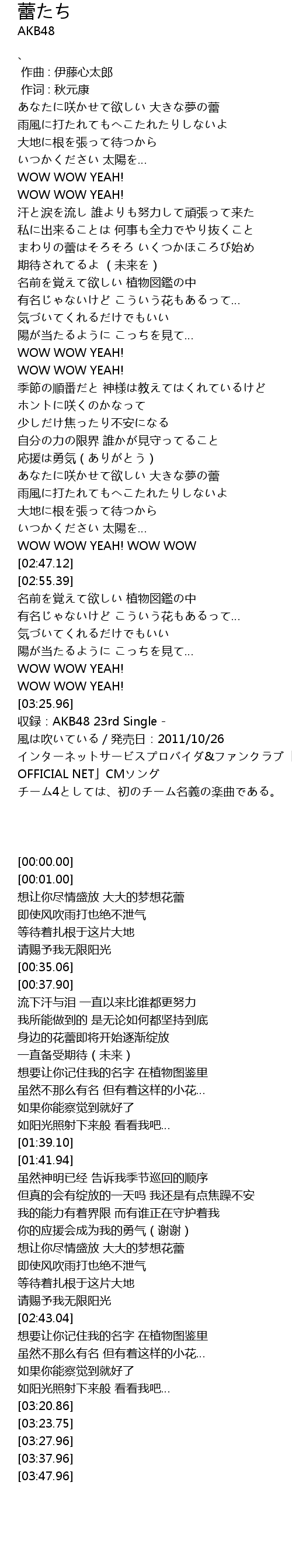 | [03:27.96] | 収録:AKB48 23rd Single - 風は吹いている/発売日:2011/10/26 |