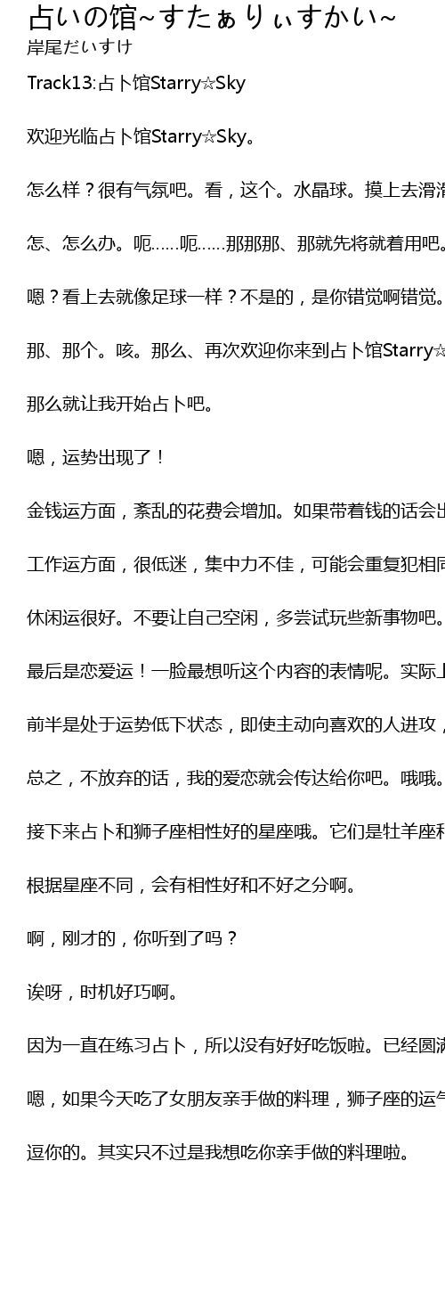 | 那、那个。咳。那么、再次欢迎你来到占卜馆Starry☆Sky。嘿嘿,吓了一跳吧。我今天可是占卜师哦。我会完美地认真地占卜狮子座的运势的。 | |