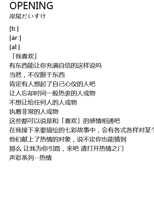 | [00:35.07] | zai wo jie xia lai yao miao hui de qi cai gu shi zhong, hui you ge shi ge yang dui mou ge dui xiang qing zhu le re qing de ren wu deng chang |
