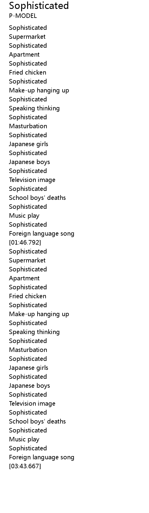 | [01:22.738] | Sophisticated |