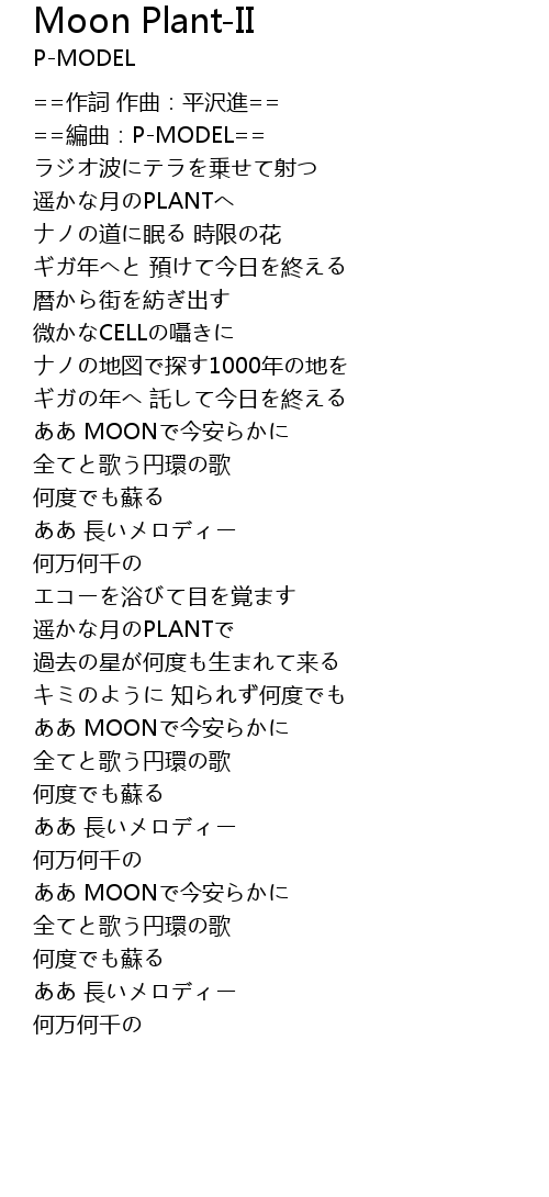 | [00:05.473] | ==作詞 作曲:平沢進== |