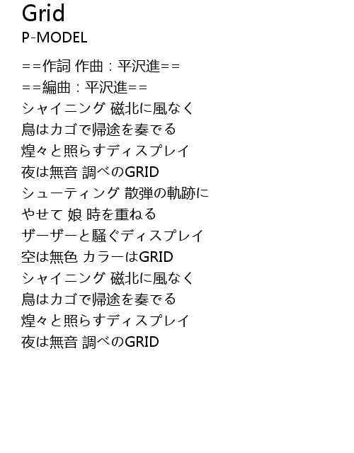 | [00:02.181] | ==作詞 作曲:平沢進== |